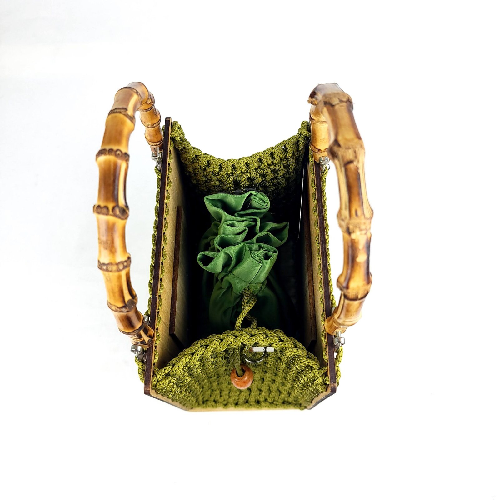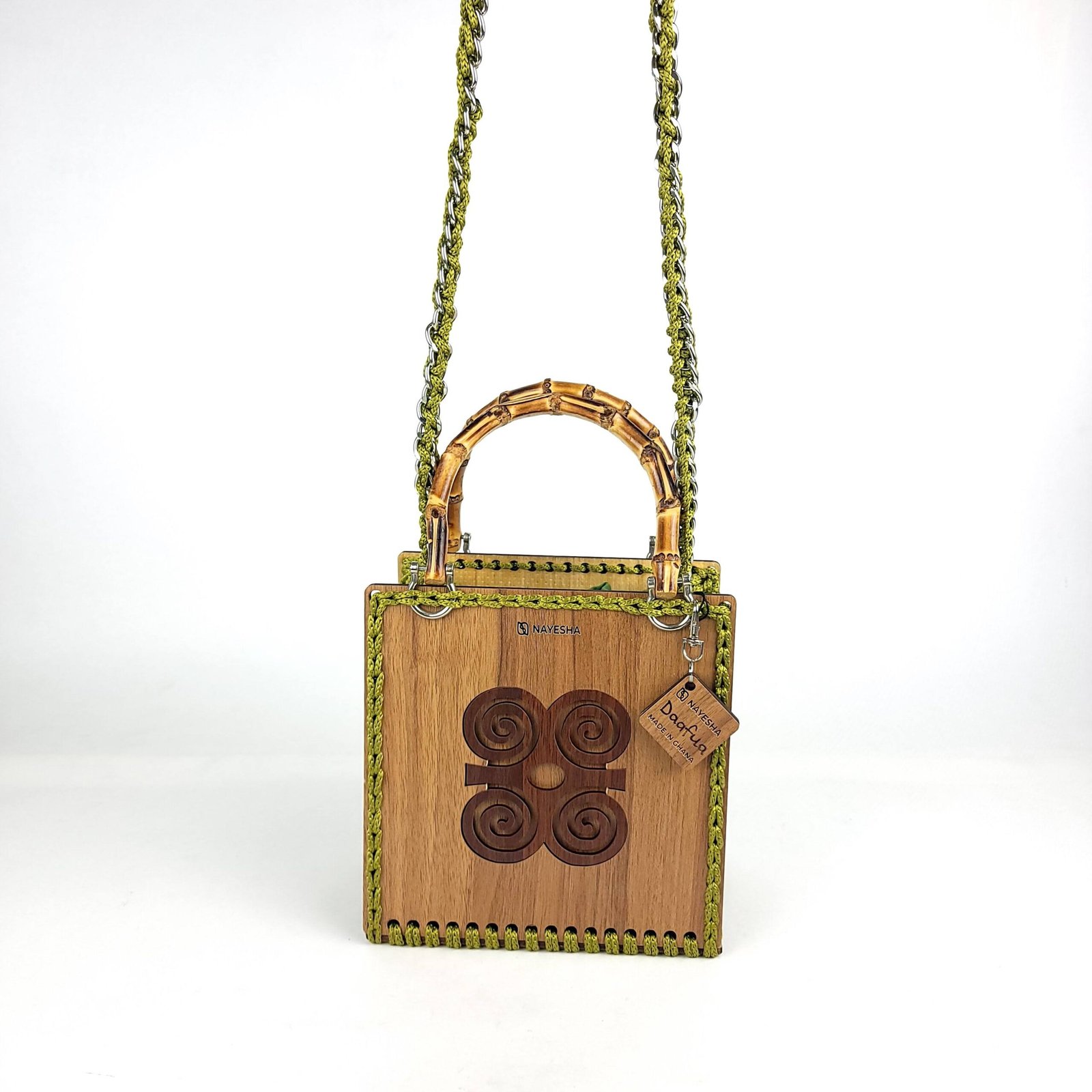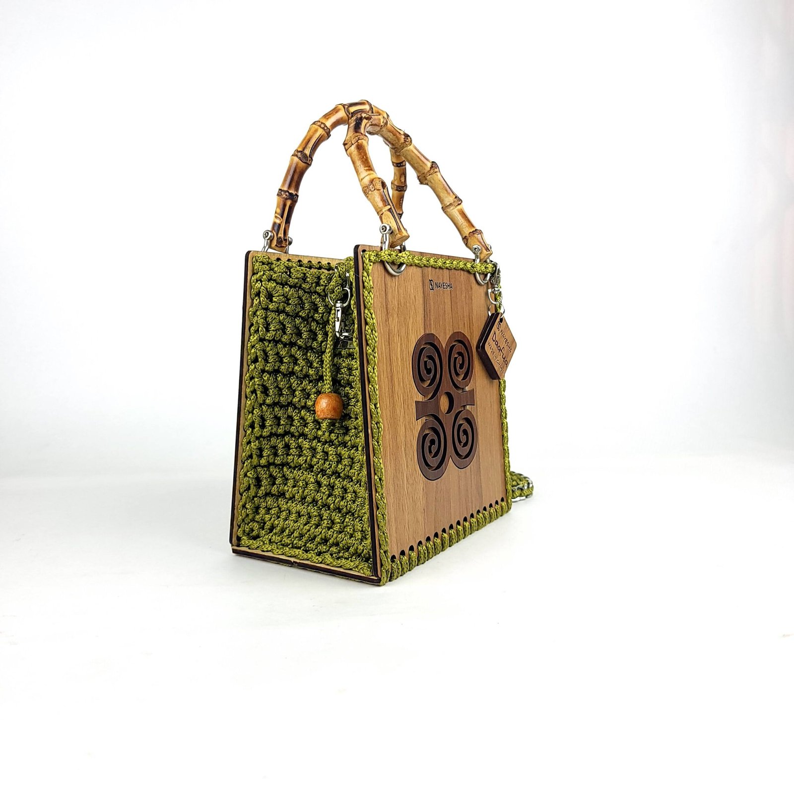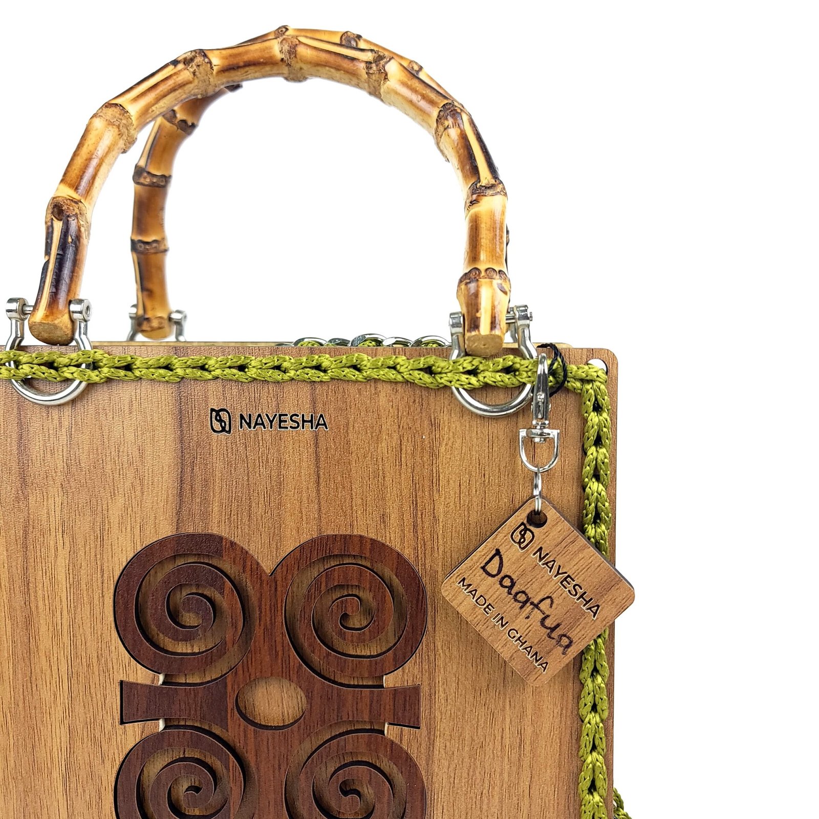 The Daafua Handbag: a versatile, handcrafted masterpiece with a detachable shoulder strap, elegant intertwined crochet with chain, and a unique wood carved, metallic, or acrylic plate, or crochet, bamboo, or wooden handle, along with a practical drawstring pouch.