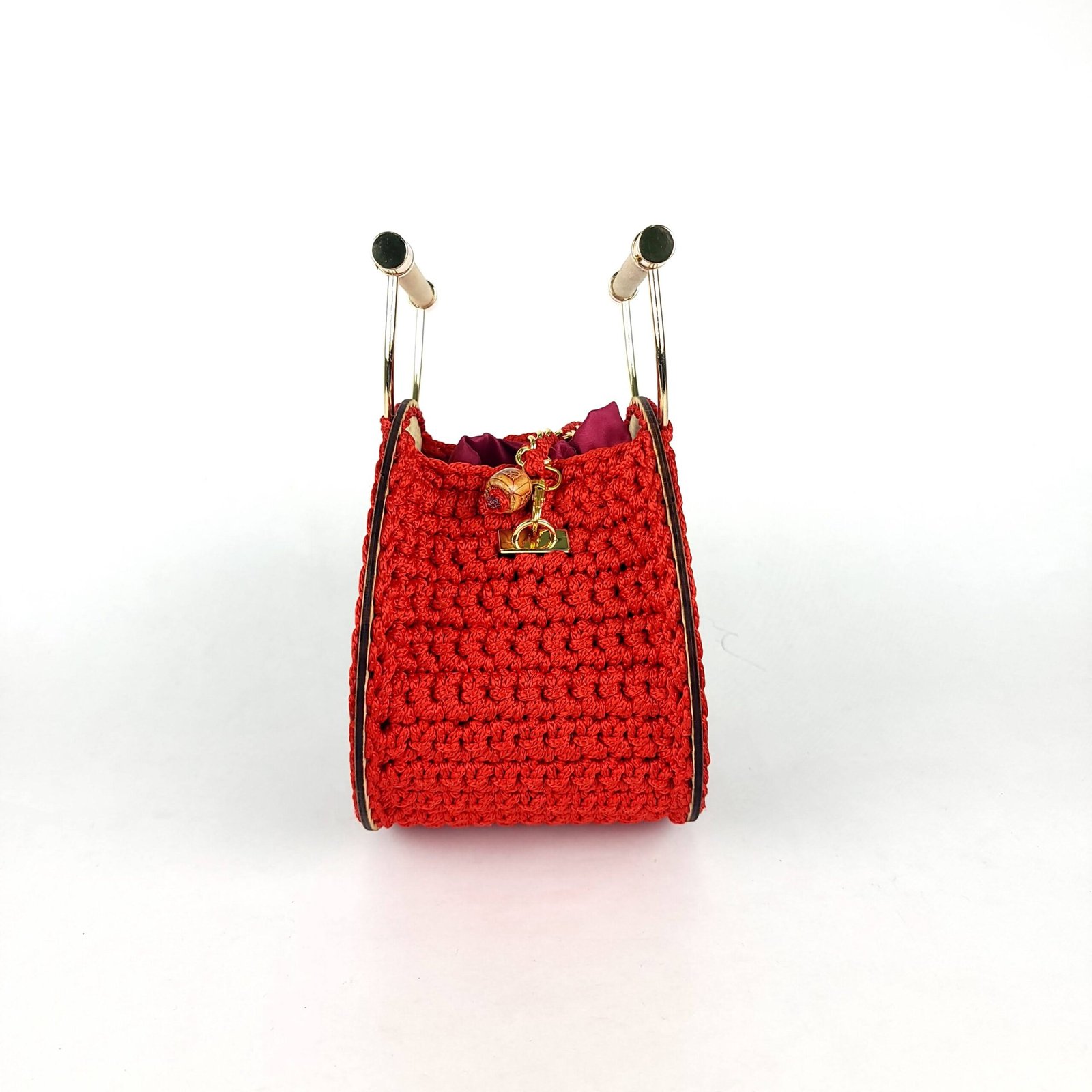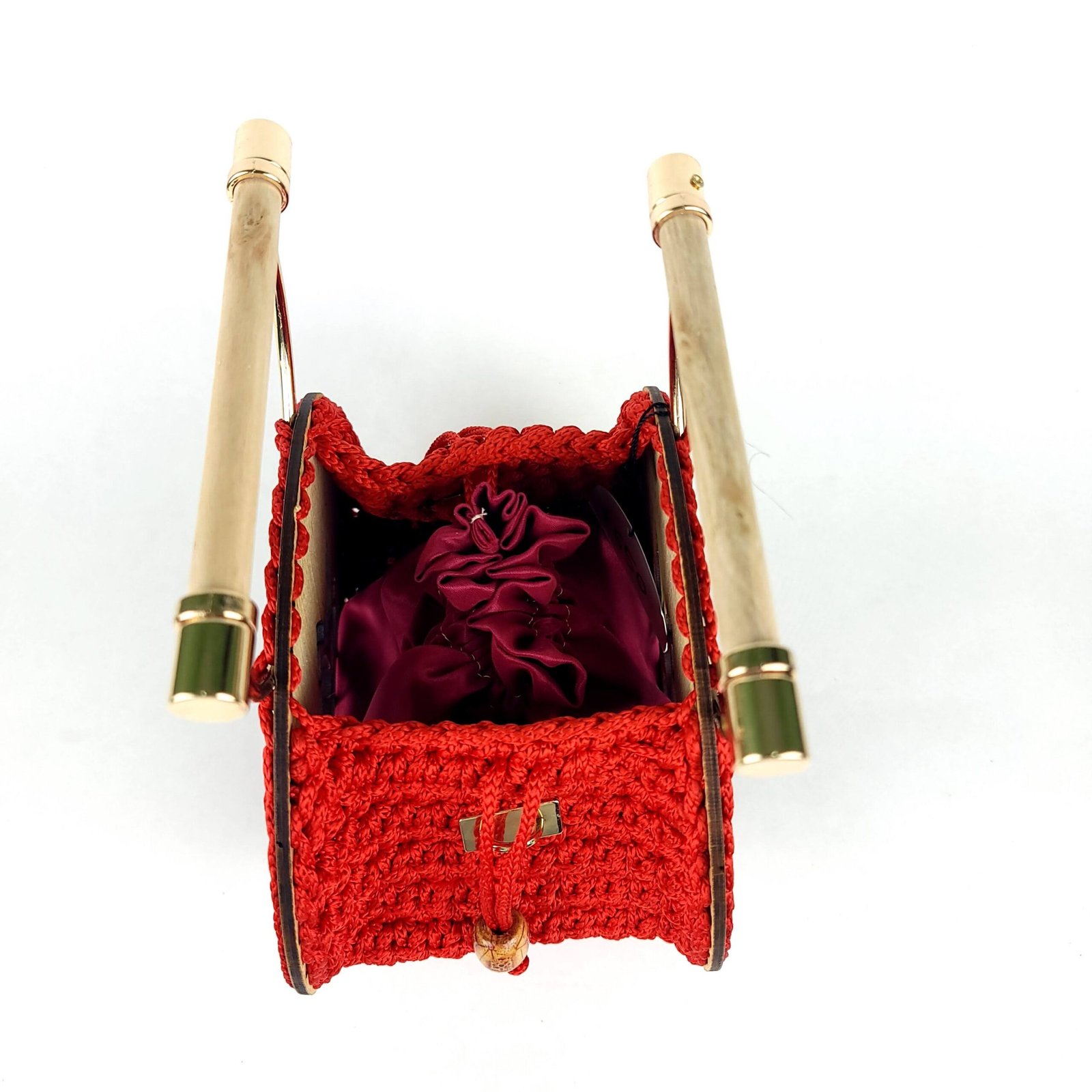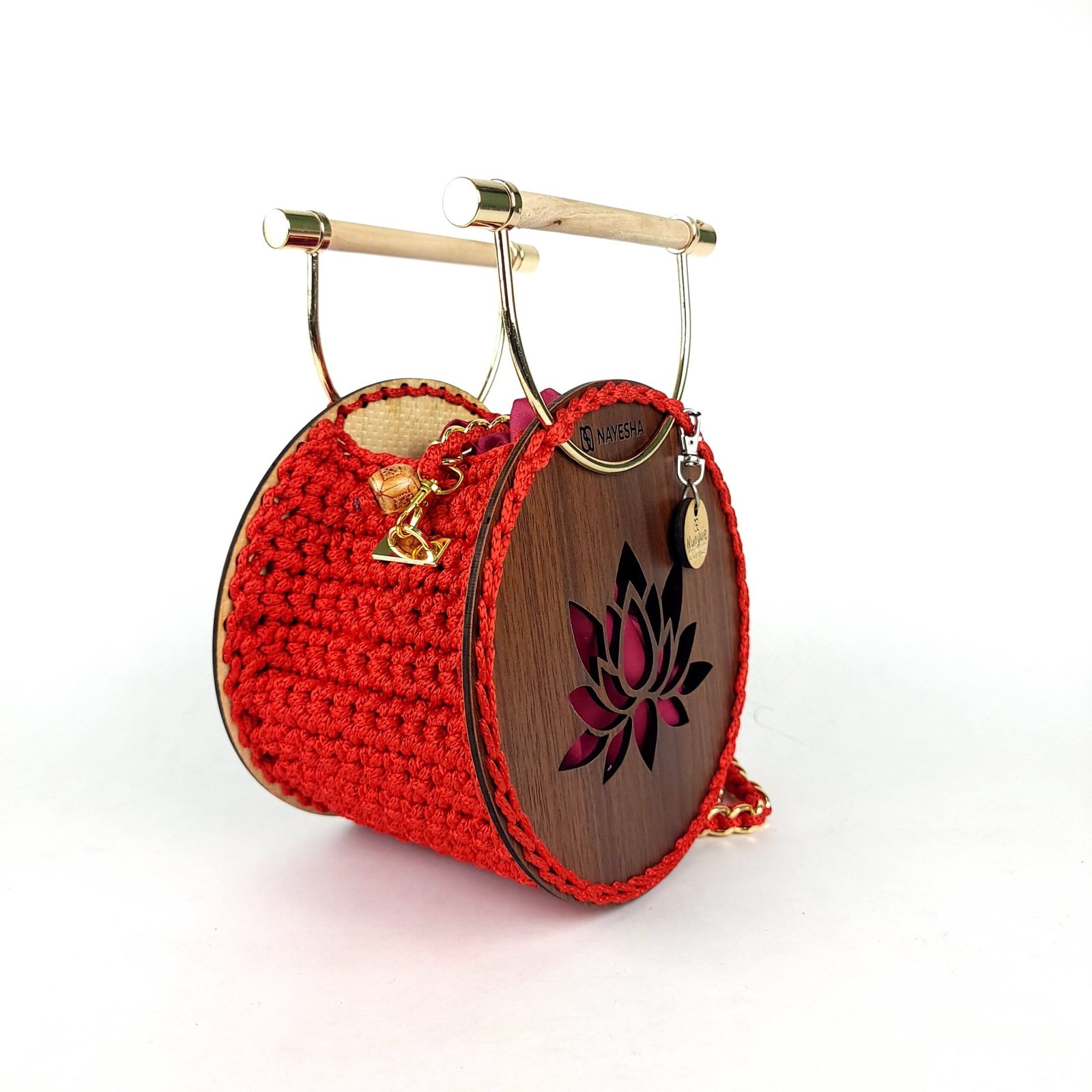 This handcrafted bag boasts a unique crochet body intertwined with a chain, a detachable shoulder strap, a chic wooden handle, and a drawstring pouch, ensuring style and versatility.