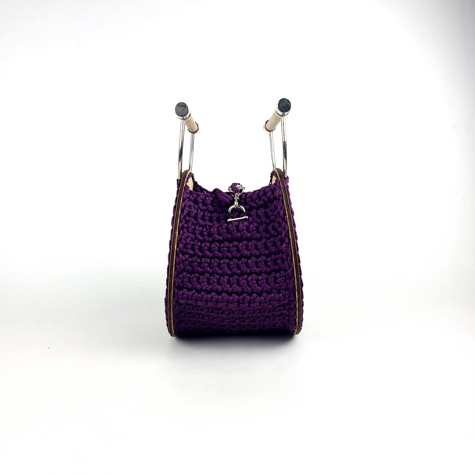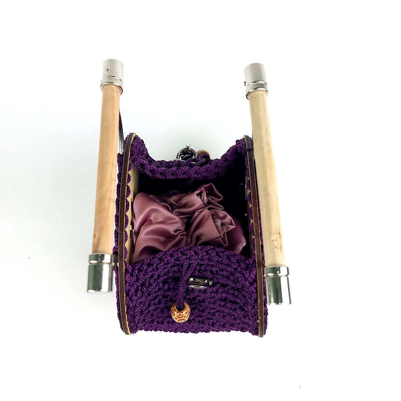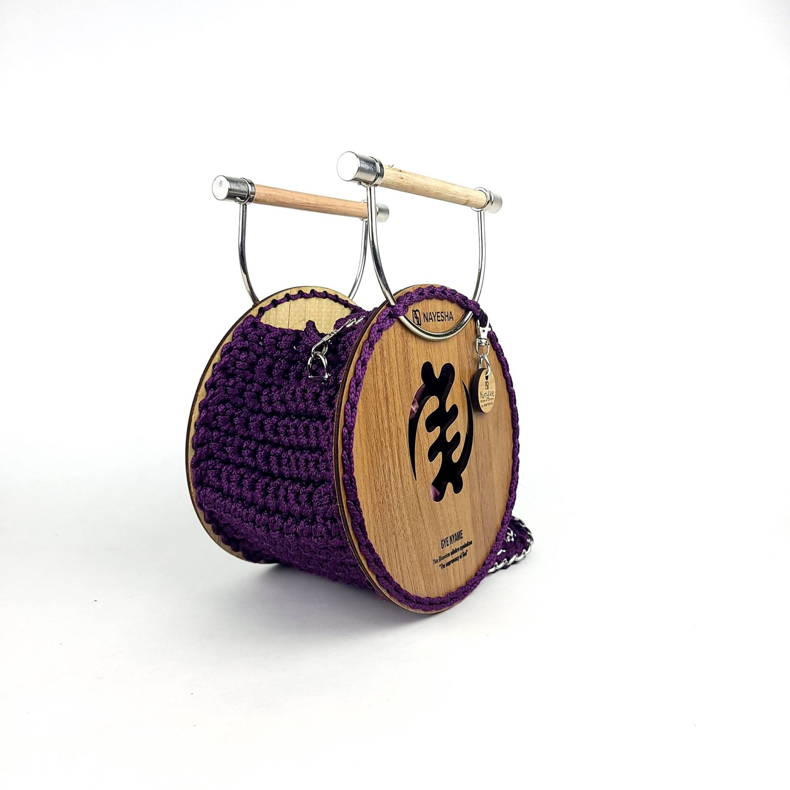 This handcrafted bag boasts a unique crochet body intertwined with a chain, a detachable shoulder strap, a chic wooden handle, and a drawstring pouch, ensuring style and versatility.
